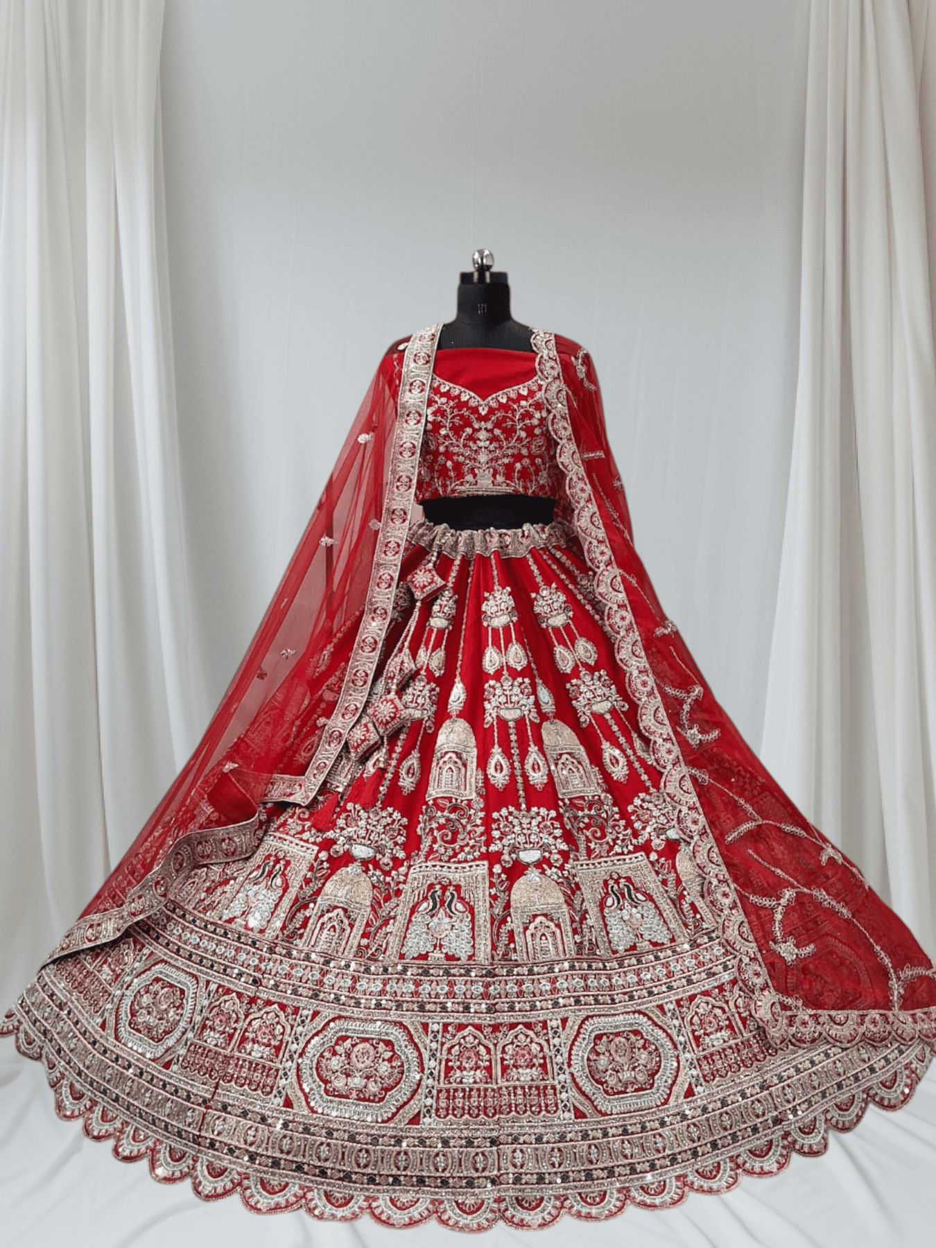 The heavy flared skirt features breathtaking temple and floral patterns, enhanced with shimmering gold threadwork and bead embellishments. The richly embroidered blouse pairs perfectly with the soft net dupatta, finished with a scalloped embroidered border adding grace and elegance to every twirl.